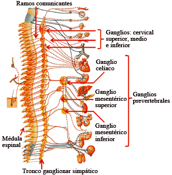 | TRONCOS SIMPÁTICOS | Dos troncos nerviosos con ganglios en toda la columna vertebral: 3 del cervicales, 11 o 12 torácicos, 4-5 lumbares, 4-5 sacros. SE SITÚAN ANTERIOR A LAS APÓFISIS TRANSVERSAS. |