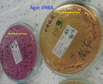 Medio selectivo y Rto en alimentos * Inhibe biota G(+) ==> Sales biliares y Cristal violeta *Indicador pH ==> Rojo neutro - pH ↑: Amarillo - pH ↓: Rojo Hidrato fermentable ==> Lactosa (color rojo purpura con precipitado de bilis rojiza) |
