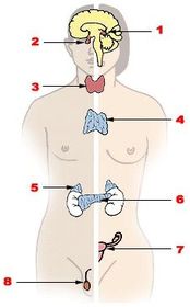 1. Hipotálamo 2. Hipófisis 3. Tiroides y paratiroides 4. Timo 5. Páncreas 6. Glándulas suprarrenales 7. Gónadas (ovarios y testículos) |