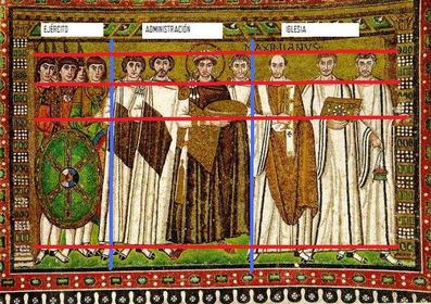 En cuanto a la composición: El arte mural bizantino recoge la tradición griega de mosaico y no la romana, que a diferencia de esta los coloca en tierra principalmente. Estos mosaicos tienen un sentido simbólico. En cuanto al tema: ejemplo claro del Cesaropapismo imperante en Bizancio, donde el Emperador se situaba más arriba del Obispo (y del Papa) y tenía una función doctrinal más importante. Ello se demuestra en la presencia de las imágenes de Teodora y Justiniano en el ábside de la Iglesia, lugar reservado únicamente para Dios. |