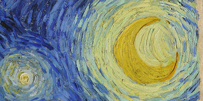 Hay el cielo nocturno llena de nubes con movimiento giratorio rápido, estrellas ardiendo con su propia luminosidad, y una luna creciente brilla. El cielo mantiene el movimiento en los ojos de la audiencia, siguiendo las curvas y creando una imagen punto a punto con las estrellas. Este movimiento capta la audiencia mientras que los otros rasgos tienen efectos también |