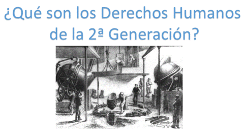 La constituyen los derechos económicos, sociales y culturales, debido a los cuales, el Estado de Derecho pasa a una etapa superior, es decir, a un Estado Social de Derecho. Surgen durante la Revolución Industrial. Ejemplos: Derecho al trabajo, a un buen salario y a formar sindicatos. |