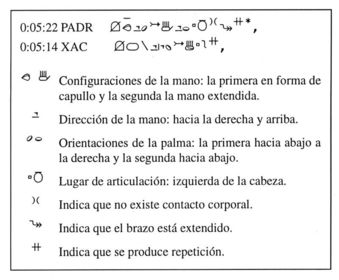 | Mª Ángeles Rodríguez habla de seis parámetros: | QUEIREMA, o forma/ configuración de la mano TOPONEMA, o lugar de articulación KINEMA, movimiento de la mano KINEPROSEMA, o dirección del movimiento de la mano QUEIROTROPEMA,u orientación de la mano PROSOPONEMA, o expresión de la cara. |