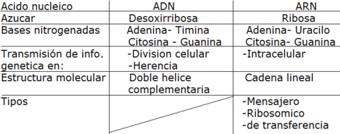 | ARN Mensajero | -Funcion: portar un mensaje en codigo que determinado los aminoacidos de la proteina a formar copiando las secuencias de nucleotidos codificadas en el ADN (dentro del nucleo) |