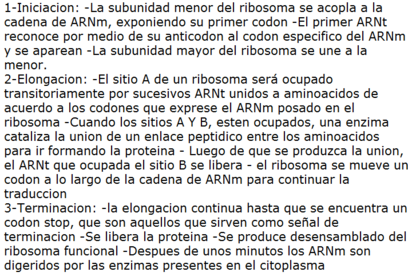 | Etapas del proceso de sintesis -Traduccion | Definicion: es el proceso que permite que la informacion contenida en el ARNm como secuencia de bases nucleotidicas se exprese (traduzca) en forma de aminoacidos. |