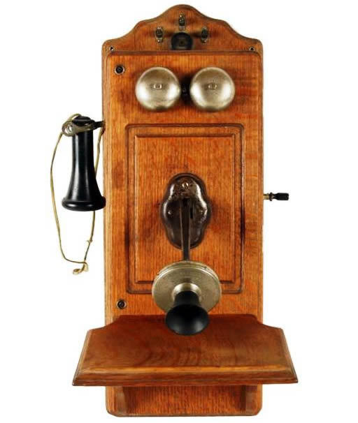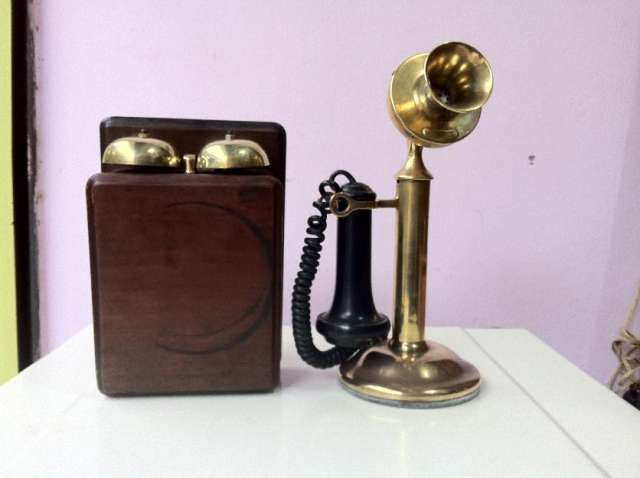| En 1905, la compañía Chicago creó una serie de mesa o teléfono candelabro. Esta serie fue creada para que el usuario pudiese tener un mejor manejo del teléfono mientras hablaba. | El mismo año, Almon B. Strowger creó su teléfono candelabro de 11 dígitos. Este era distinto a los demás ya que tenía 22 números en forma de círculo en el mango del teléfono. Al crear este teléfono, sus intenciones eran eliminar a los operadores. Obtuvo su patente por este teléfono en 1891. |