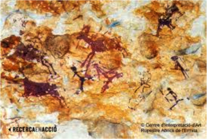 | ART RUPESTRE LLEVANTÍ Àmplia zona del litoral mediterrani de la Península Ibèrica. Narren les lluites de diversos grups, escenes de recolecció al camp o escenes de caça, etc. Simples línies en relleu, farcides de color (destaca el vermell). | |