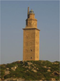 TORRE D'HÉRCULES A Coruña. Far de 57m i 1900 anys d'antiguitat situat a la costa. Únic far romà que segueix en funcionament. La seva llegenda diu que Hèrcules va arribar amb barca a la costa i va enterrar allà el cap del gegant GErió després de derrotar-lo en combat. |