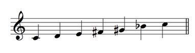 | ¿Cuál es esta escala? | Escala de Tonos Enteros (no tiene semitonos) o Hexátona (seis tonos) Entre los sonidos consecutivos siempre hay una distancia de tono. Las notas alteradas pueden enarmonizarse, - por eso podemos cambiar el la# por un sib - y, como sólo hay seis distancias de tono, la escala tendrá sólo 6 notas + la duplicación a la 8ª de la que funcione como tónica (en la imagen el Do') |