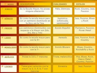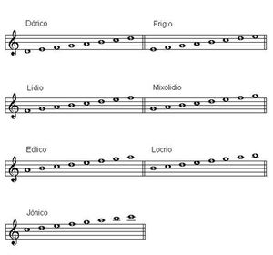 | ¿Cuáles son estas escalas? | A estas escalas las llamamos MODOS NATURALES. Consisten en series de sonidos sin alterar a partir de cada nota de la escala. Estas componen un total de siete escalas diferentes ya que dan lugar a diferentes combinaciones de tonos y semitonos. La escala Jónica coincide con la de Do Mayor. La escala Eólica, con la de La menor natural. |