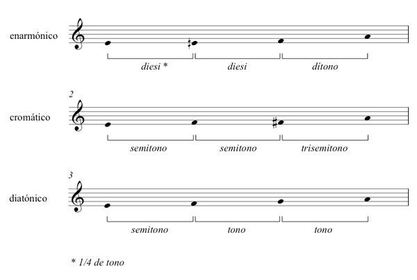 | Explica la imagen | Se trata de los géneros armónicos griegos, es decir, los distintos tipos de tetracordo que pueden emplearse. En clase nos hemos centrado en el género diatónico, base de nuestra escala diatónica. |
