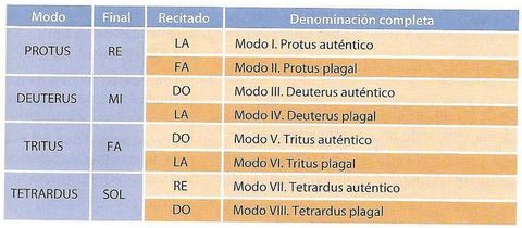 | Son los ocho Modos Eclesiásticos de la Música Medieval. Indica los nombres, la Finalis y la Repercutio. | |