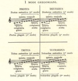| En la imagen podemos ver la explicación de los Modos Gregorianos (eclesiásticos o medievales) tal como os la expuse en clase. Podemos observar la 5ª central, común a los modos según su clasificación en Protus, Deuterus, Tritus o Tetrardus. | |