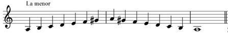 | Indica las características de esta escala. | Se trata de la escala menor por su distribución de Tonos y Semitonos (T-S-T-T-S-T-T) pero la alteración del VIIº la convierte en el tipo que llamamos: Menor Armónica. Su tónica en la imagen es La, por lo que se trata de la escala de La Menor Armónica. |
