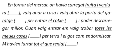 | Activitat 2 | Del text següent, substitueix per pronoms febles els complements directes que tens subratllats |