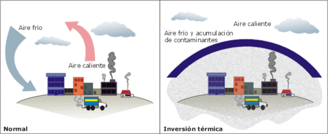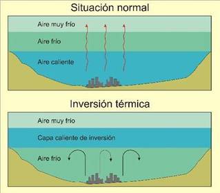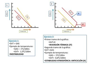 | En algunas condiciones, junto a la superficie o entre ciertas alturas, el GVT puede ser negativo, este fenómeno se conoce como INVERSIÓN TÉRMICA, es decir, que hay AIRE CÁLIDO por encima de AIRE FRIO, implica, dificultad de mezcla de aire (solo ocurre en situaciones de tiempo frío y estable) | |