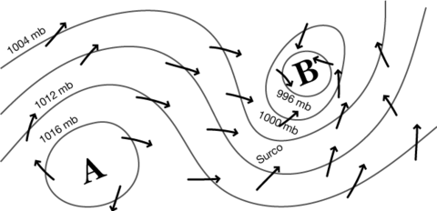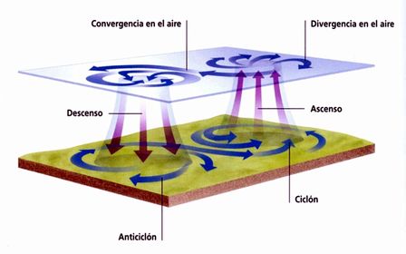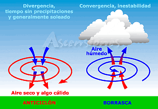 | - BORRASCAS o DEPRESIONES. zonas de baja presión, el aire caliente asciende, se producen nubes y a menudo precipitaciones. El viento en superficie gira en sentido antihorario | |