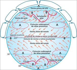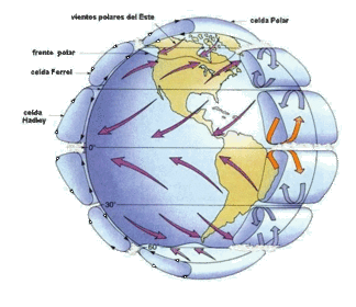 | PRINCIPALES ZONAS DE CIRCULACIÓN ATMOSFÉRICA. - C. de HADLEY (0º-30º) - C. POLAR (90ª-60º) - C. de FERREL(30º.60º) | |