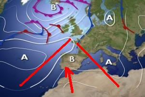 | Dos centros semipermanentes que condicionan la situación meteorológica en la Península Ibérica son el ANTICICLÓN de las AZORES que desvía los frentes de orígen polar hacia el N. y las BAJAS PRESIONES DE ISLANDIA que envía esos frentes hacia Europa Occidental | |