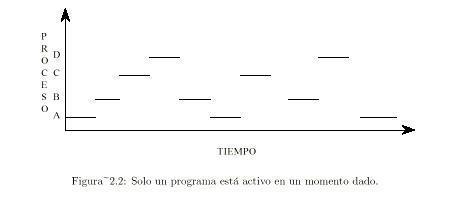| Características del modelo de procesos | Todo el software ejecutable se organiza en varios procesos. Un proceso incluye al programa en ejecución y los valores activos del contador, registros y variables. Conceptualmente cada proceso tiene su propia cpu virtual. |