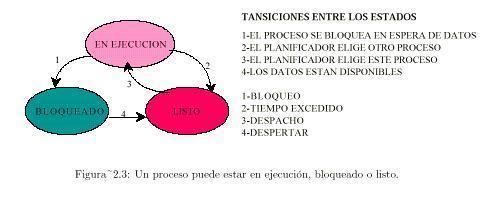 Los estados que puede tener un proceso: En ejecución: utilizando la cpu. Listo: ejecutable, se detiene en forma temporal para que se ejecute otro. Bloqueado: no se puede ejecutar debido a la ocurrencia de algún evento externo (ej esperar datos de e/s). |