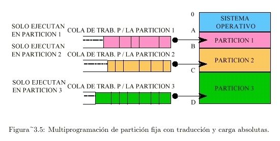 Las “particiones” del AM principal son de tamaño fijo, alojan un proceso cada una y la cpu se cambia entre los procesos creando la ilusión de simultaneidad. Los trabajos se traducían como cargas absolutas para ser ejecutados solo dentro de una partición específica. |