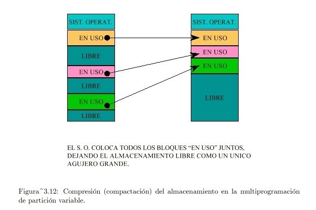 | Multiprogramación de Partición Variable | Los procesos ocupan tanto espacio como necesitan, no hay límites fijos de memoria. Se consideran “esquemas de asignación contigua”, dado que un programa debe ocupar posiciones adyacentes de almacenamiento. |