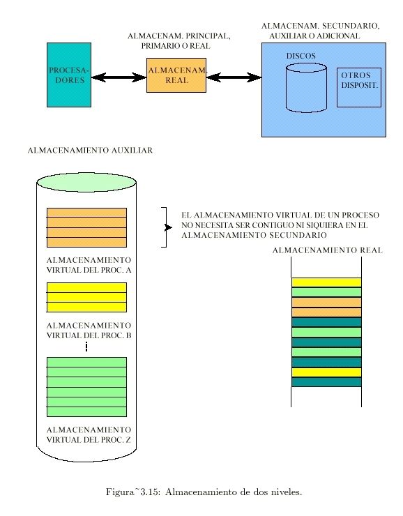| Estrategias de organización y administración del almacenamiento principal | Organización: ej, ¿se coloca un solo programa o varios ?, ¿se concede a cada uno la misma cantidad de espacio o se divide el almacenamiento en “particiones”?. Administración: ¿cuando se busca un programa y a cuál reemplaza?. |
