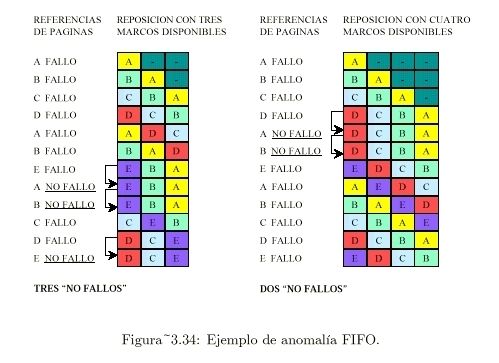 Belady, Nelson y Shedler descubrieron que con la reposición FIFO, ciertos patrones de referencias de páginas causan más fallos de páginas cuando se aumenta el número de marcos (celdas) de páginas asignados a un proceso. |
