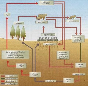 | CICLOS POR LOS QUE PASA EL NITRÓGENO: FIJACIÓN DE NITRÓGENO: en este proceso interviene bacterias presentes en el suelo y en ambientes acuáticos, llamados bacterias fijadoras de nitrógeno. estos microorganismos pueden ser de vida libre o vivir asociados a las plantas como la bacteria de del genero "RHIZOBIUM". |