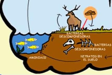 | Amonificación: los microorganismos descomponedores, para producir su alimento usan la materia orgánica del suelo para liberar exceso de nitrógeno en forma de amoniaco o amonio dejándolo en el suelo |