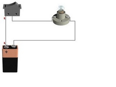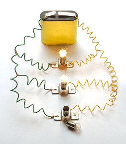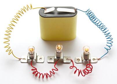 | Circuito en serie La corriente recorre todos los elementos del circuito por un único camino. Si una ampolleta del circuito está quemada la otra dejará de funcionar ya que es solo un camino | |