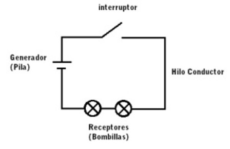 | Partes de un circuito eléctrico: Hilos conductores: por ellos circula la corriente. Generador: fuente de energía eléctrica que produce la corriente eléctrica Receptores: reciben la energía y la transforman en otro tipo de energía Interruptor: controla el circuito | |