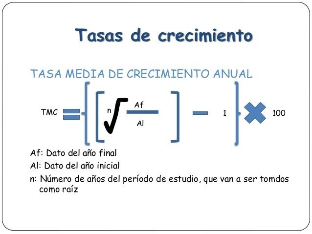 | La Tasa de Crecimiento Media Anual nos permite conocer como creció o decreció la población de un territorio determinado en un lapso de tiempo. En el cálculo se incorpora el número de nacimientos menos las defunciones (crecimiento natural) y el número de inmigrantes menos el de emigrantes (crecimiento social). | |