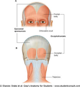 | Musculo occipitofrontal | Vientre frontal: *Origen--> Aponeurosis epicraneal *Inserccion--> piel y tejido subcutáneo de las cejas y la frente Vientre Occipital: *Origen--> 2/3 laterales de la linea nucas superior *Inserccion-->Aponeurosis epicraneal |
