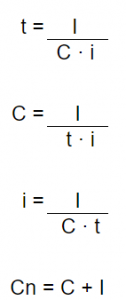 | Equivalencias fórmula del interés simple | I = C · (i / 100) · t si t son años I = C · (i / 200) · t si t son semestres I = C · (i / 1200) · t si t son meses I = C · (i / 400) · t si t son trimestres I = C · (i / 36000) · t si t son días I = C · (i / 600) · t si t son bimestres |