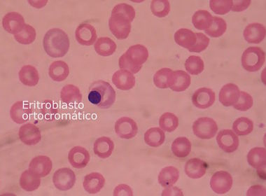 Eritroblasto ortoctomático/ Normoblasto ortocromático/ Metarubricito | Tamaño: 12 - 15 micras Posee una forma redonda. Núcleo picnótico, redondo basófilo, relación con citoplasma 1:2, puede ser excéntrico y ocasionalmente puede estar fragmentado. El citoplasma es bastante acidófilo por la presencia de hemoglobina en el medio.No presenta inclusiones ni organizas evidentes. En condiciones normales se encuentra en la médula ósea, de 10 - 15%. |