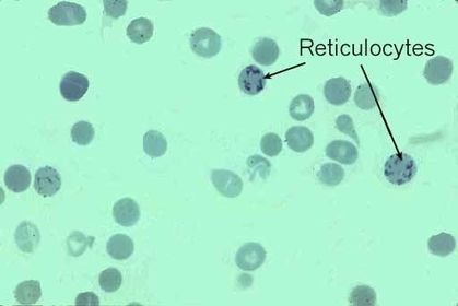 Reticulocito/ Eritrocito policromático/ Eritrocito difusamente basófilo | Tamaño: 8 - 11 micras Célula redonda, anucleada con citoplasma acidófilo por la presencia de grupos hemo (Hb y hierro). Posee pequeños restos de ARN basófilo en el citoplasma. Su ubicación es en la médula ósea y en sangre periférica en baja proporción. |
