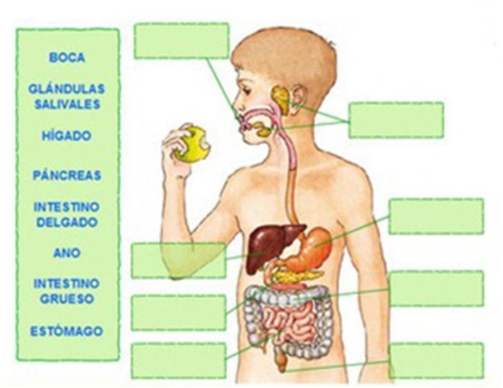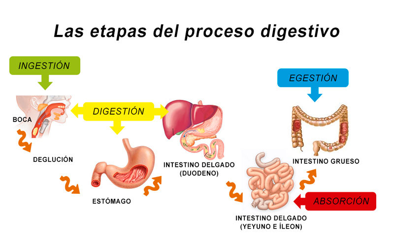 ¿Cuál es el proceso de la digestión? | Boca (saliva y bolo alimenticio). Faringe, esófago y desemboca en el estómago. Estómago (el bolo se mezcla con los jugos gástricos y se forma el quimo). Intestino delgado (jugo pancreático, bilis y jugos intestinales. Se transforma en el quilo). En las vellosidades del intestino delgado tiene lugar la absorción de nutrientes y el paso a la sangre. Por último, el intestino grueso absorbe el agua restante y forma las heces fecales que se expulsan a través del ano. |