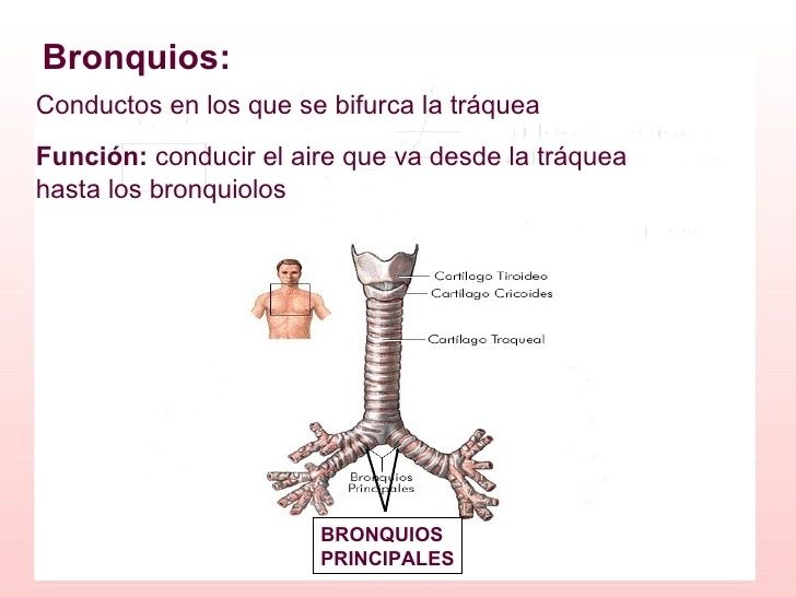 ¿Qué son los bronquios? | Son dos tubos que entran en los pulmones, allí se ramifican en otros conductos cada vez más finos y pequeños llamados bronquiolos. |