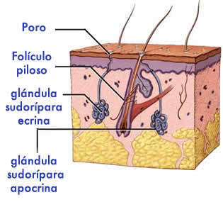 ¿Cómo funcionan las glándulas sudoríparas? | Se encargan de eliminar las sustancias tóxicas y de controlar la temperatura del cuerpo. Para ello, produce el sudor que se evapora en la piel y la refresca. Ayuda así a controlar la temperatura corporal. |