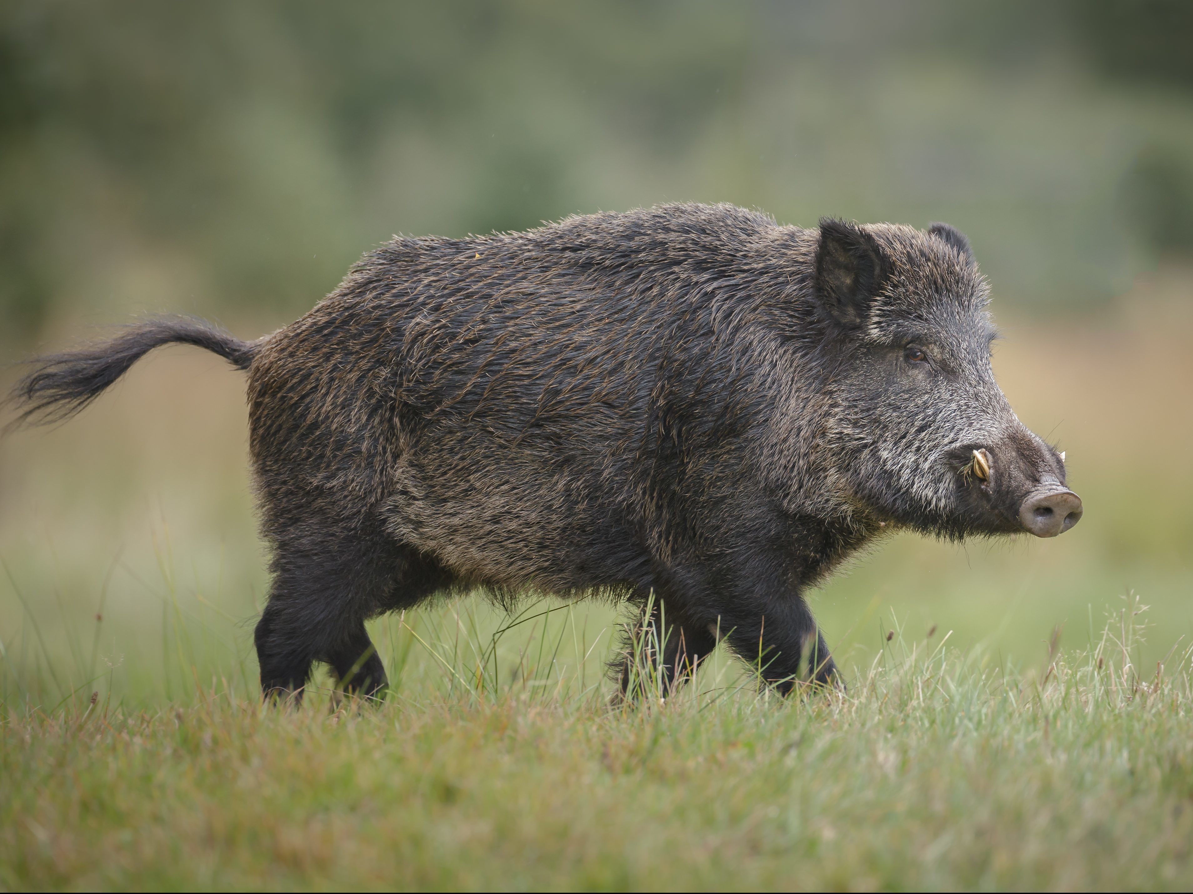 It's got a big nose and small eyes. It lives in forests. | wild boar |