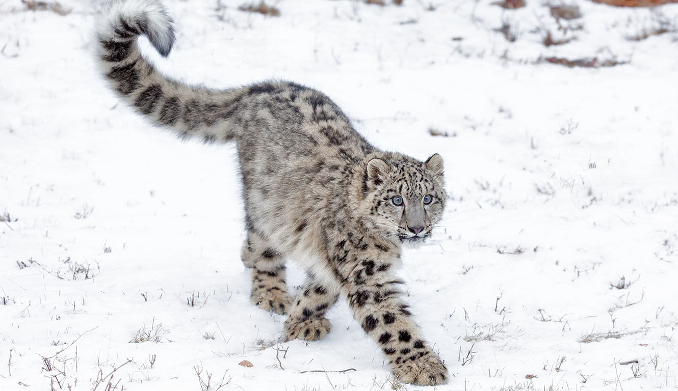 It's got white fur with black spots. It's got sharp teeth. | snow leopard |
