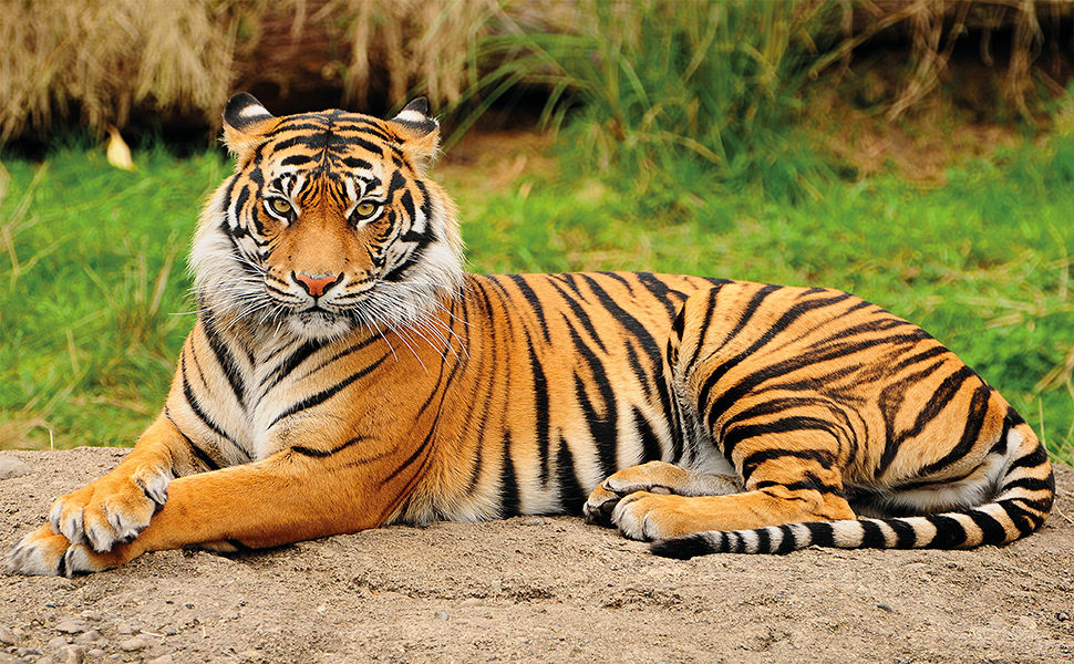It's got fur and whiskers. It's got a long tail. It's got orange and black stripes. | tiger |