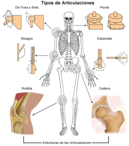 | Sinoviales o móviles: Permiten realizar una amplia gama de movimientos +Articulaciones en bisagra, gínglimo o troclear +Articulaciones planas, deslizantes o artrodias +Articulaciones en pivote o trocoides +Articulaciones esféricas o enartrosis +Articulaciones en "silla de montar" +Articulaciones condiloideas o elipsoidales Fibrosas o inmóviles Cartilaginosas o semimóviles |