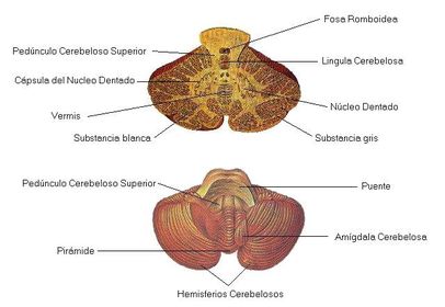 | Bulbo Raquídeo. es el centro mas importante de la vida vegetativa pues en el se encuentran situadas las conexiones centrales relacionadas con la respiración y el ritmo cardiaco | CEREBELO. Desempeña un papel regulador en la coordinación de la actividad muscular manteniendo el tono y conservación del equilibrio. |