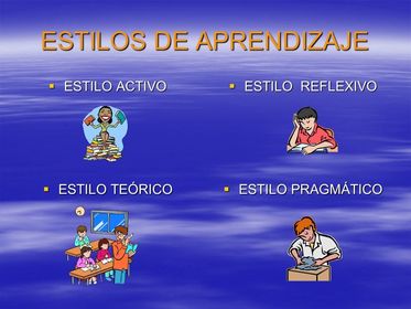 | ACTIVO: Busca experiencias nuevas, son de mente abierta, REFLEXIVO: Antepone la reflexión a la acción y observa con detenimiento las distintas experiencias. TEORICOS: Enfoque lógico de los problemas, necesitan integrar la experiencia en un marco teórico de referencia. PRAGMATICO: Su punto fuerte es la experimentación y la aplicación de ideas. Descubren el aspecto positivo de las nuevas ideas y aprovechan la primera oportunidad para experimentarlas | |