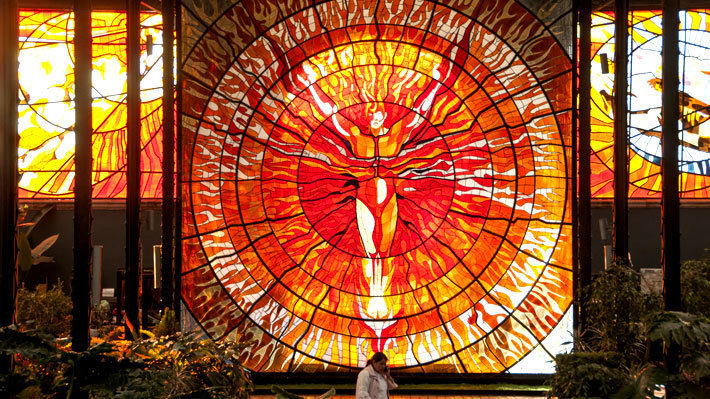Obra: "El hombre sol" Autor: Leopoldo Flores Soporte: vidrio y plomo Técnica: instalación-vidrio soplado |