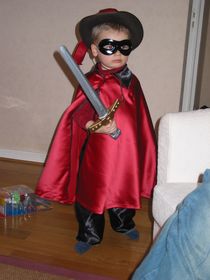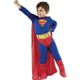 Es un niño que está disfrazado de super héroe con una camiseta de manga larga y unos pantalones largos de color azul. Lleva unos calzoncillos rojos por fuera, un cinturón amarillo y unas botas rojas. En el pecho tiene la letra "s" en color rojo con el fondo amarillo. Además, viste una capa roja desde el cuello hasta casi el suelo. | |