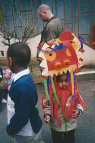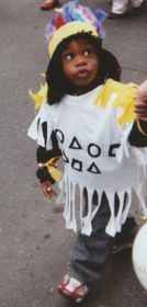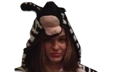 Marie va disfrazada de un animal que vive con elefantes en la sabana. Tiene rayas blancas y negras por todo el cuerpo. En la cabeza luce un hermoso gorro igualmente a rayas y sus orejas son puntiagudas. Su boca es grande y rosada. | |
